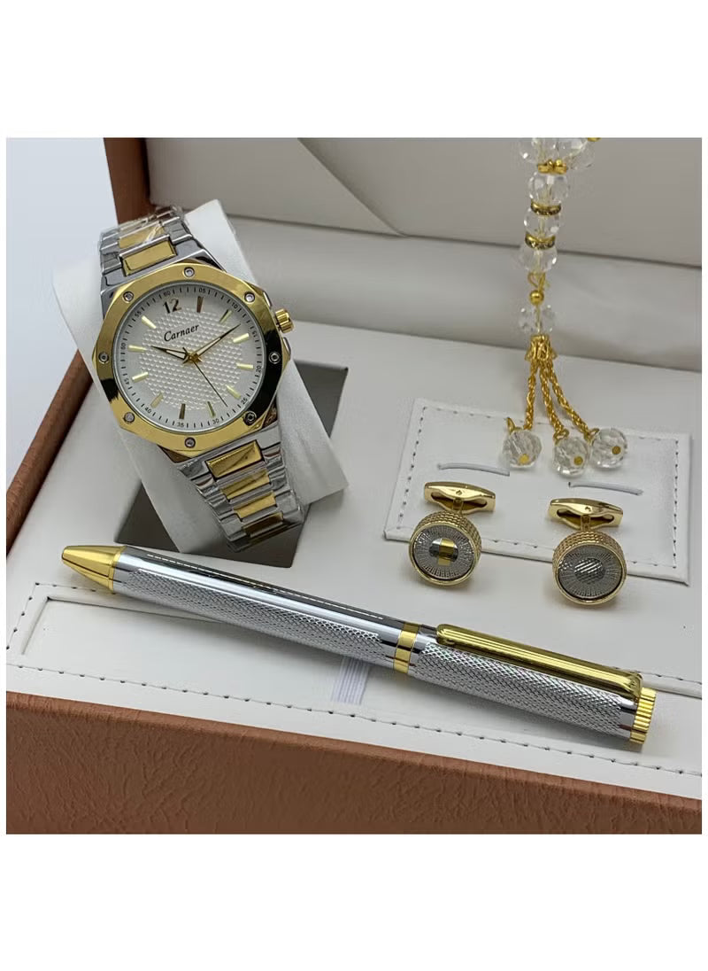 TheΒ Carnaer Men's 4-Piece Gift SetΒ is a thoughtfully curated collection designed for the modern gentleman. This set includes a stylish analog wristwatch, a sleek pen, a pair of elegant cufflinks, and a traditional rosary, all presented in a cohesive package.